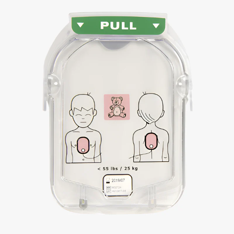 Barnelektrodkassett avsedd för Philips HeartStart HS1. När kassetten sätts i hjärtstartaren sänks energinivån automatiskt till en nivå anpassad för barn och spädbarn. Avsedd för patienter under 25 kg eller yngre än 8 år. Elektroderna är självhäftande och placeras enligt illustrationen på plattorna — en på bröstet, en på ryggen.