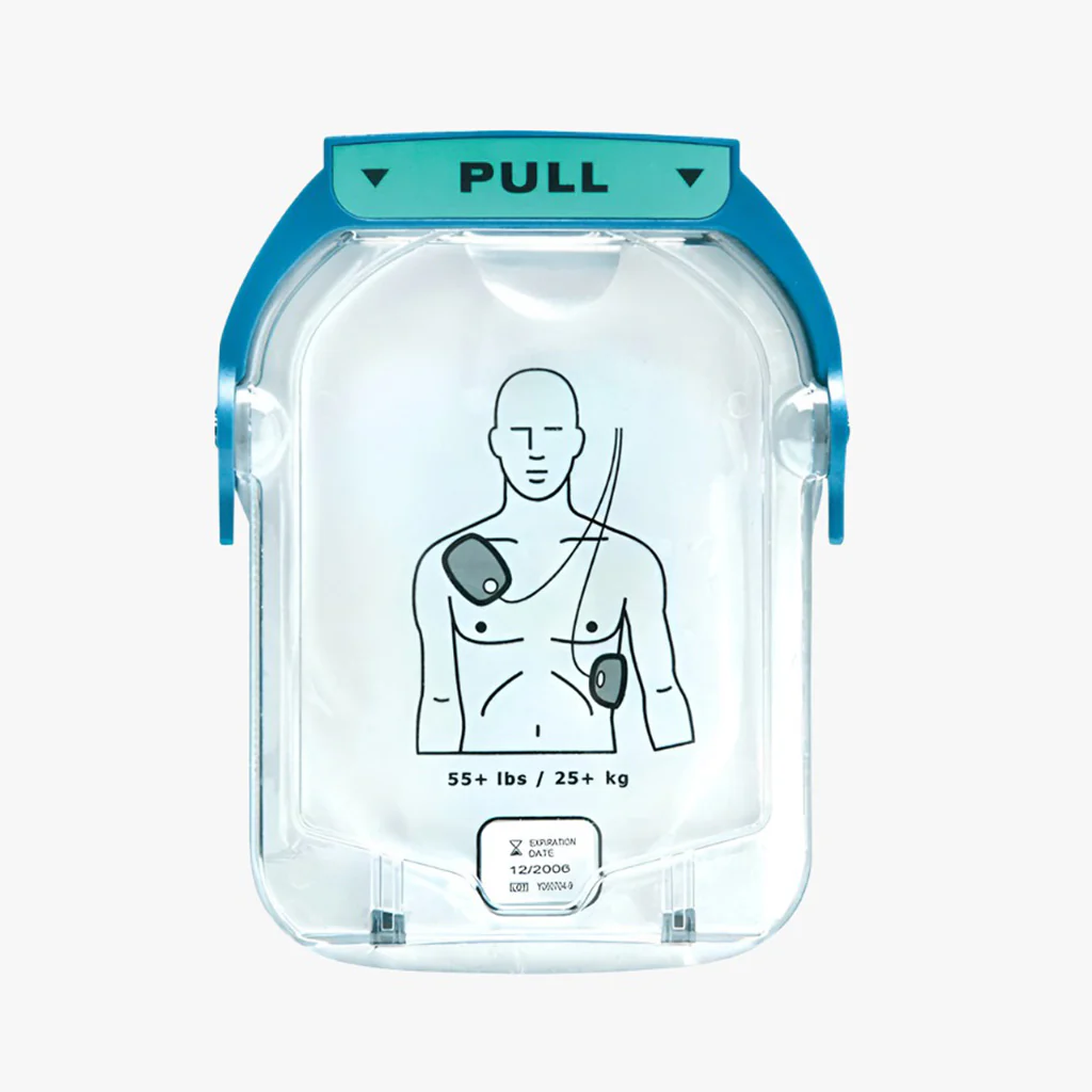 Elektrodkassett avsedd för Philips HeartStart HS1. Kassettsystemet gör bytet enkelt — skjut ut den gamla kassetten och sätt i den nya. Elektroderna är självhäftande och förinstallerade i kassetten. Hållbarheten är cirka 2 år från tillverkningsdatum. Kassetten är utformad som en engångsartikel och ska bytas efter varje användning.