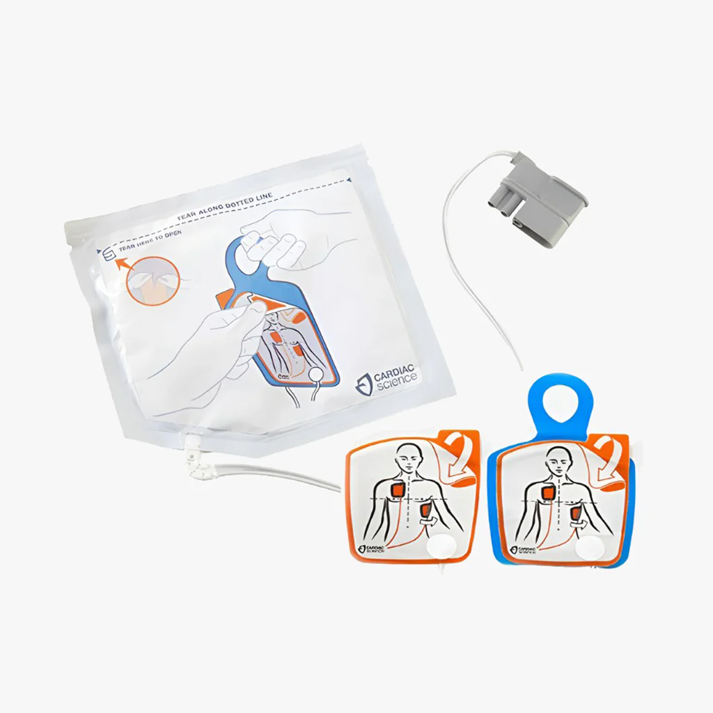 Standardelektroder för vuxna avsedda för Cardiac Science Powerheart G5. Elektroderna är självhäftande och levereras i förseglad förpackning med en hållbarhet på cirka 2 år. Placeringen framgår av illustrationerna på elektrodplattorna. Powerheart G5:s Rescue Ready-indikator övervakar elektrodernas status löpande.